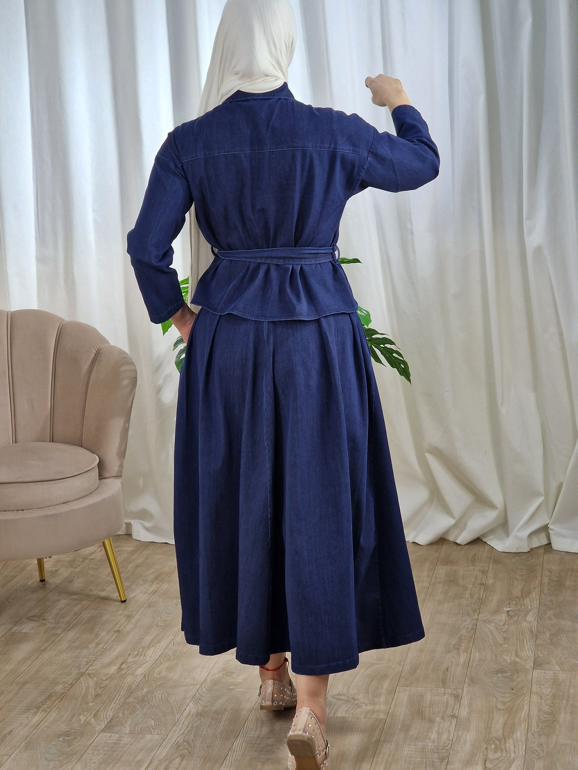 Laissez-vous séduire par cet ensemble en jean à la fois structuré et raffiné, conçu pour sublimer la silhouette tout en offrant un confort absolu.