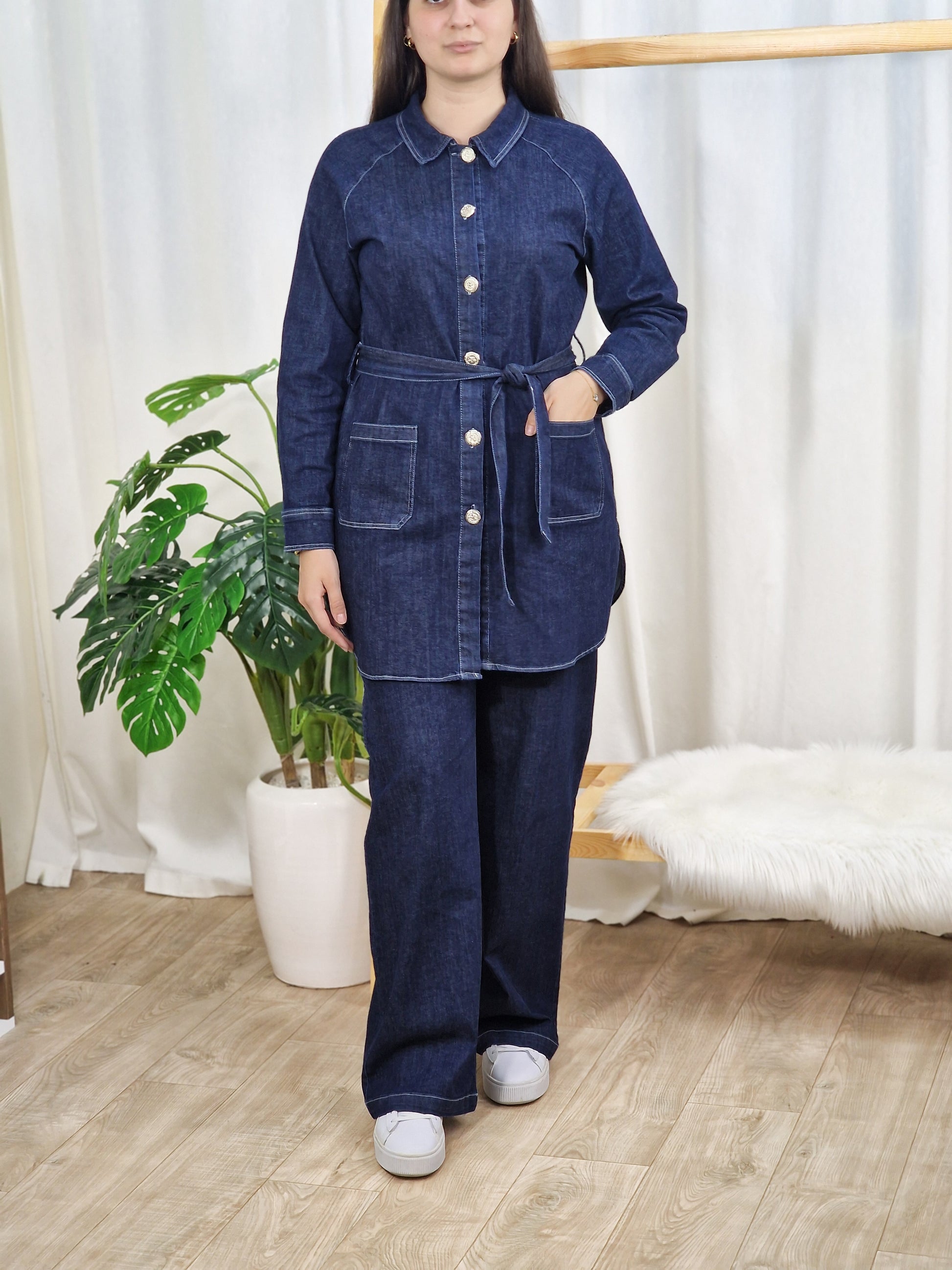 Cet ensemble en denim bleu brut allie modernité et modestie dans un style à la fois chic et décontracté.