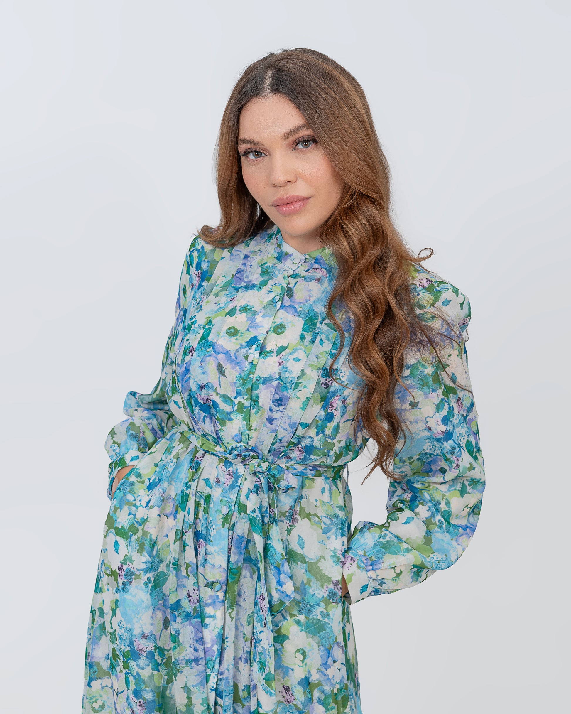 Robe en Mousseline Imprimé avec Doublure en Fibrane et Boutons Frontaux