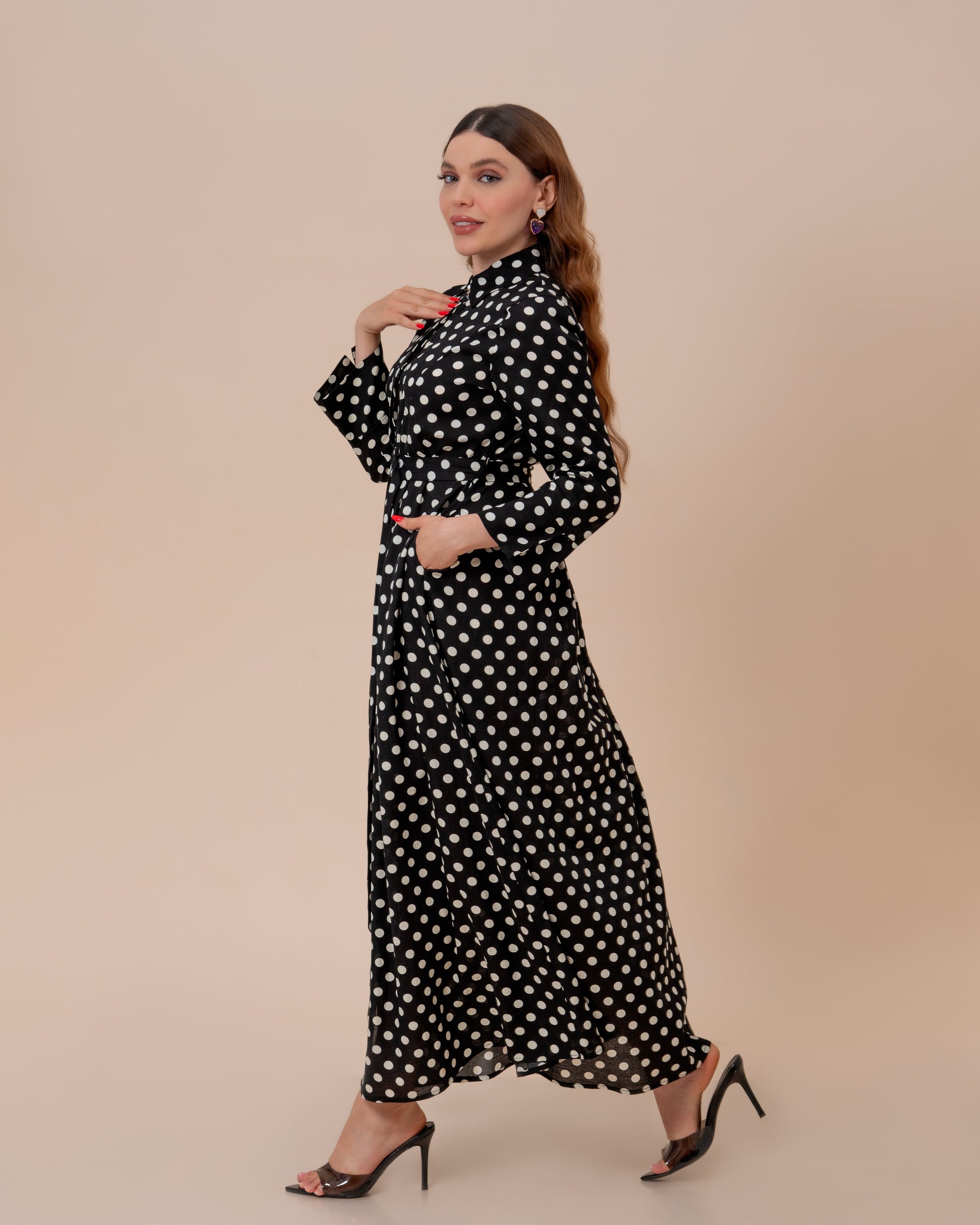 Plongez dans l'élégance intemporelle avec la robe Lina à Pois . Confectionnée en lin léger et respirant, elle séduit par son imprimé à pois classique noir et blanc, sa coupe fluide et sa ceinture qui souligne délicatement la taille. Son col chemise et ses manches longues avec finitions nouées en font une pièce à la fois chic et confortable, idéale pour vos sorties estivales ou vos occasions spéciales.