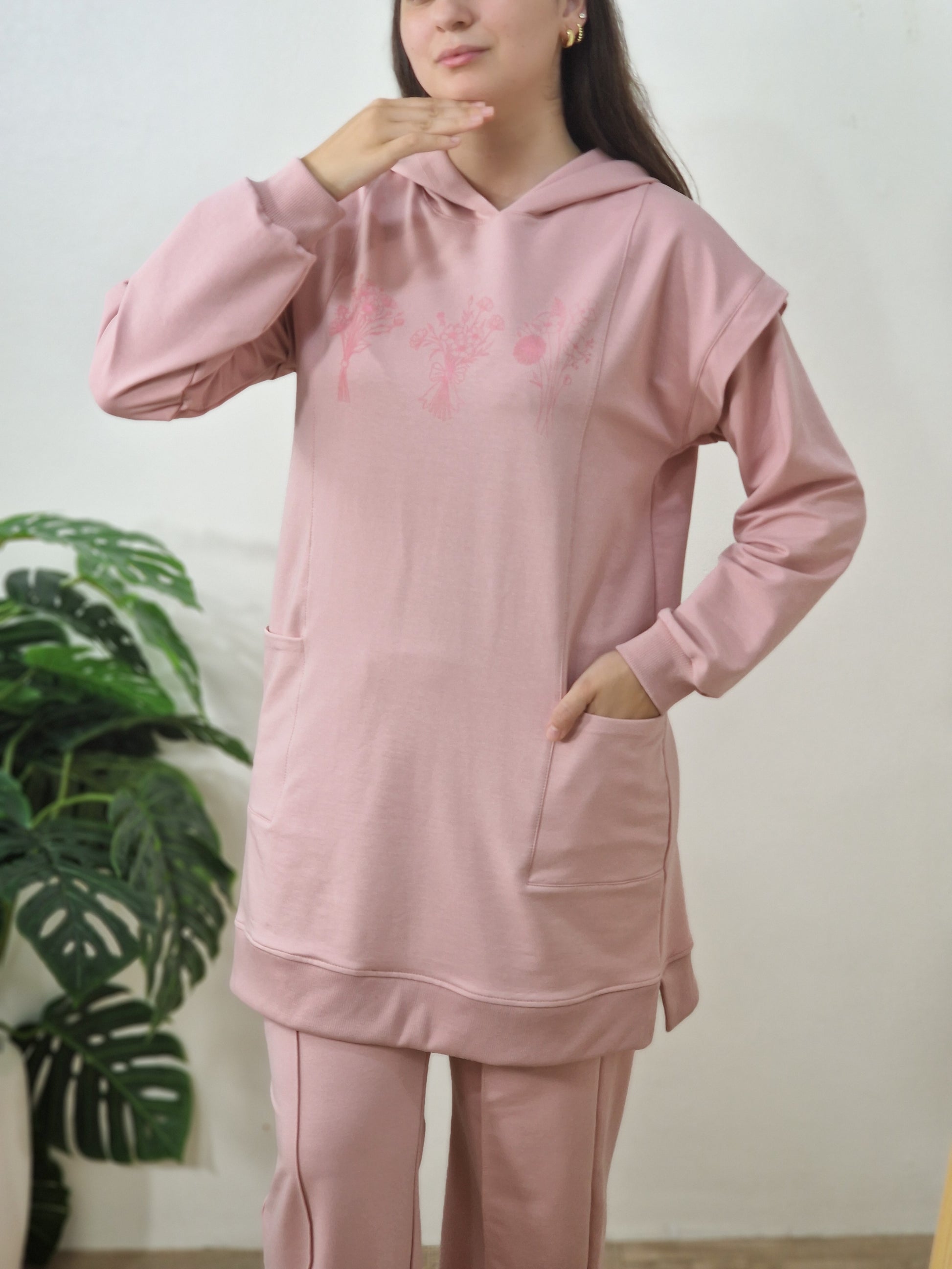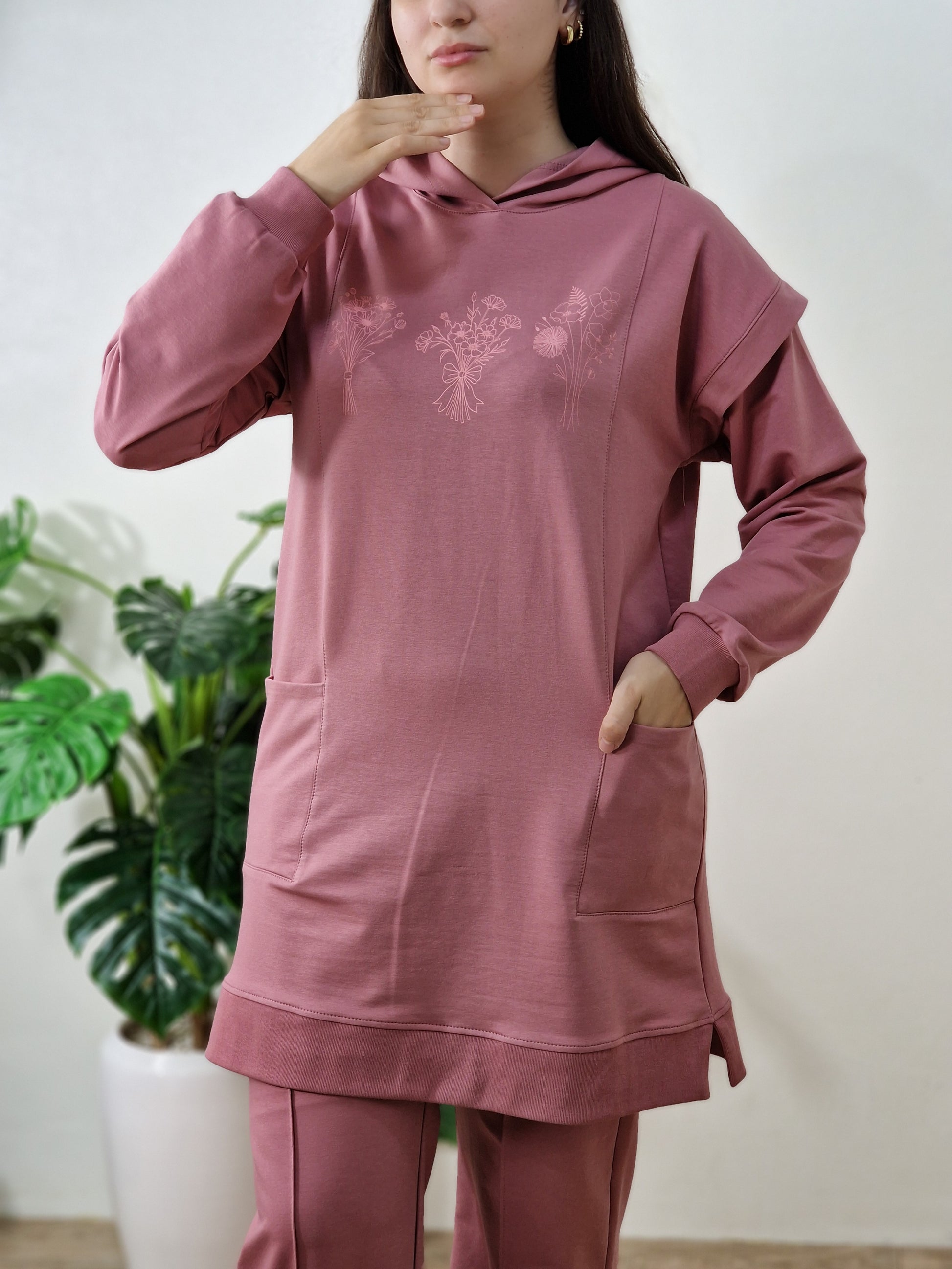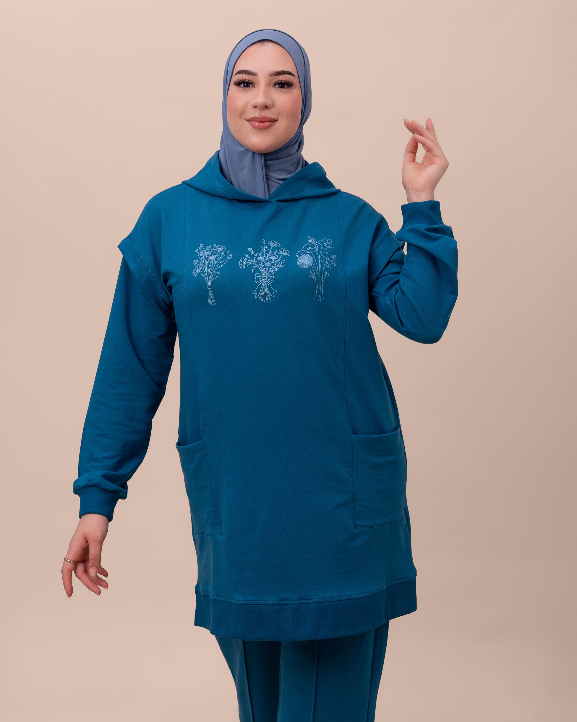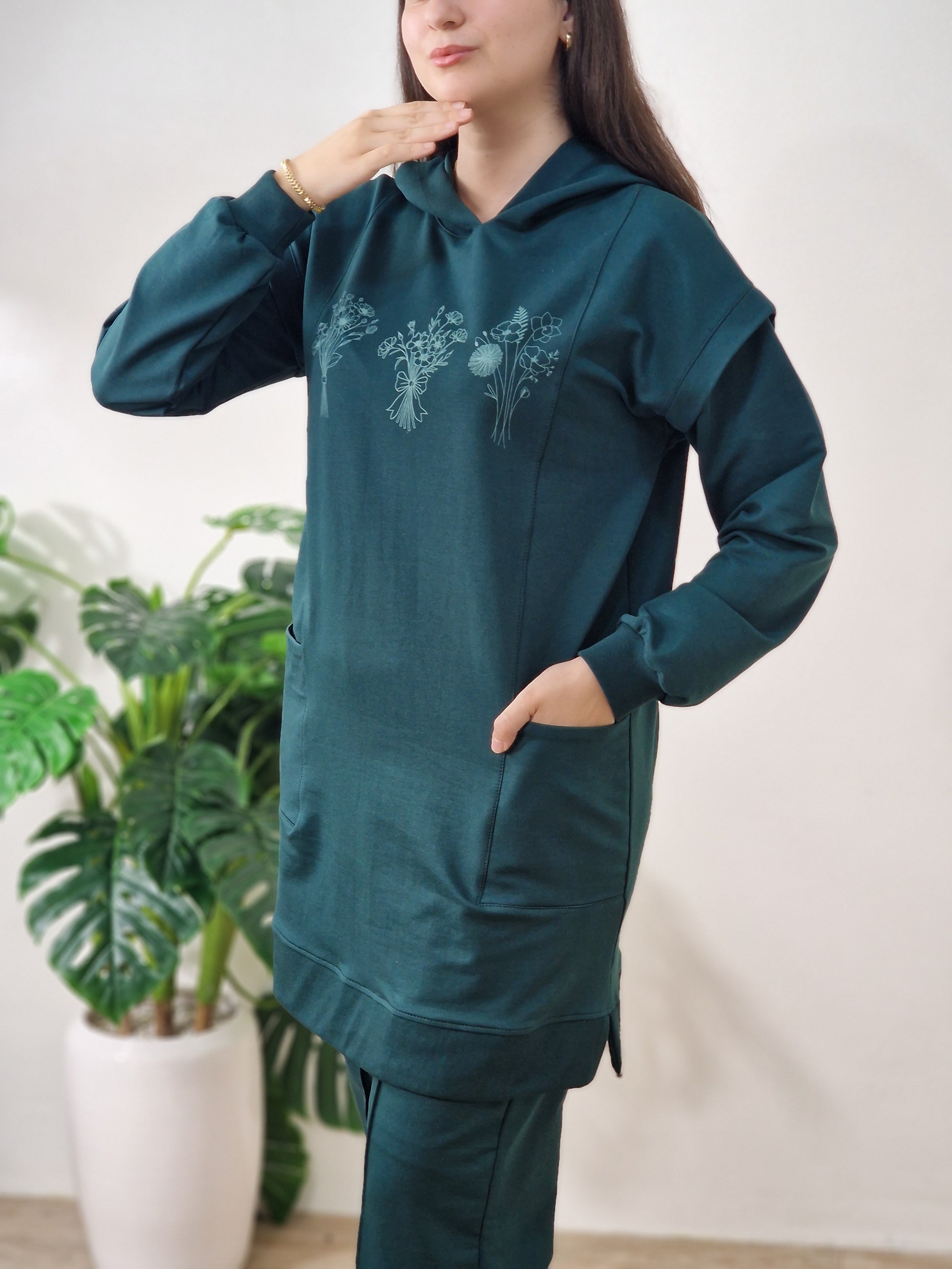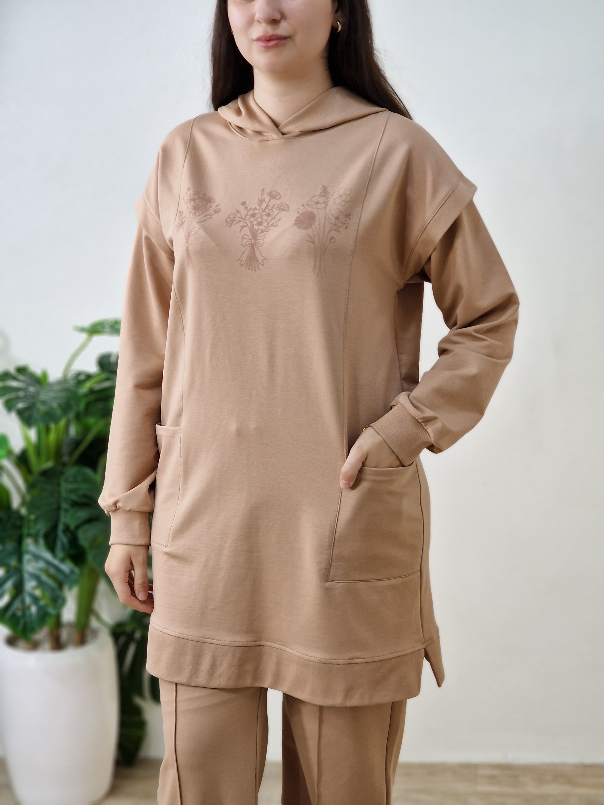 ✨ Haut hoodie long à capuche, coupe droite et confortable, décoré d’un délicat imprimé floral sur la poitrine pour une touche féminine.
