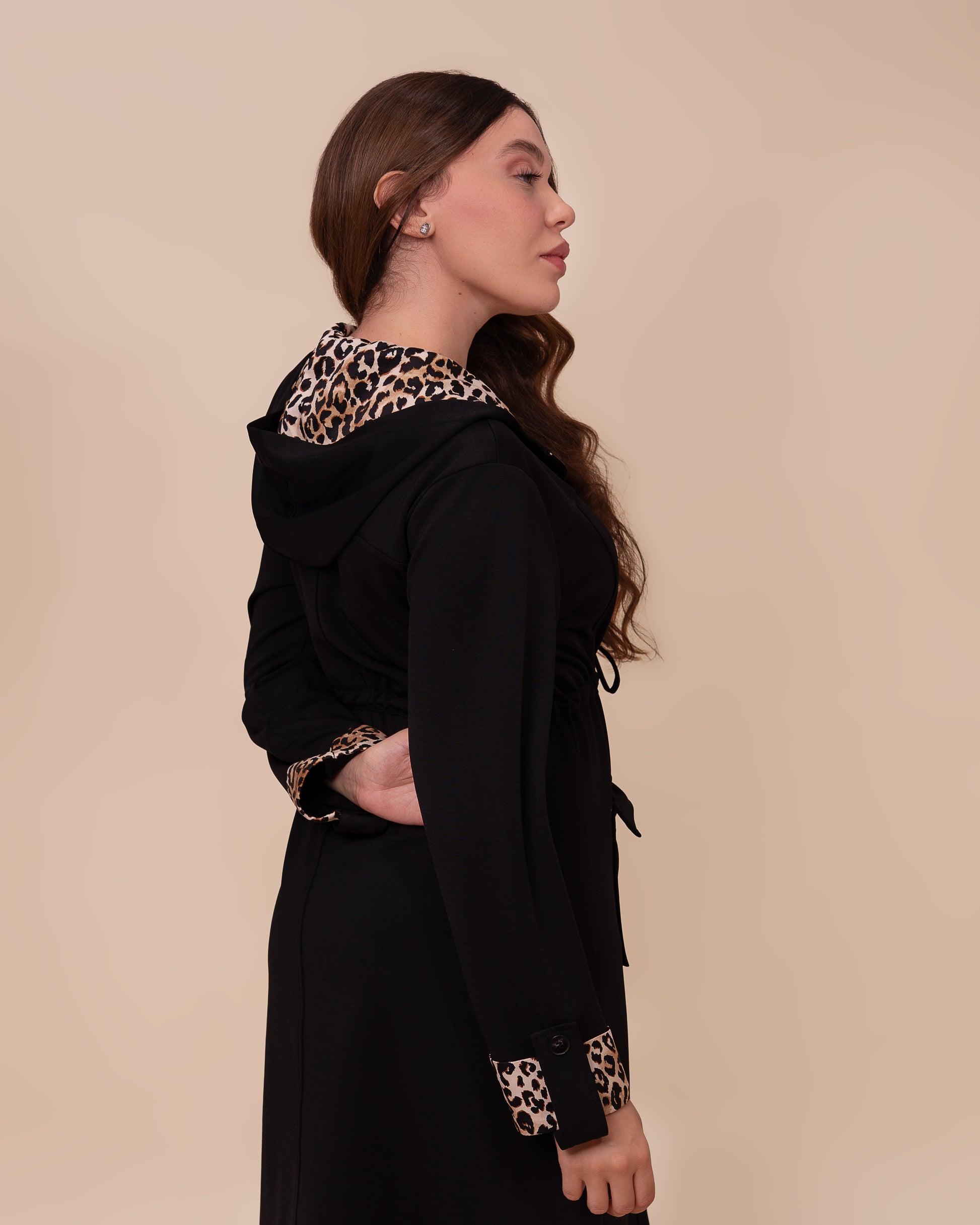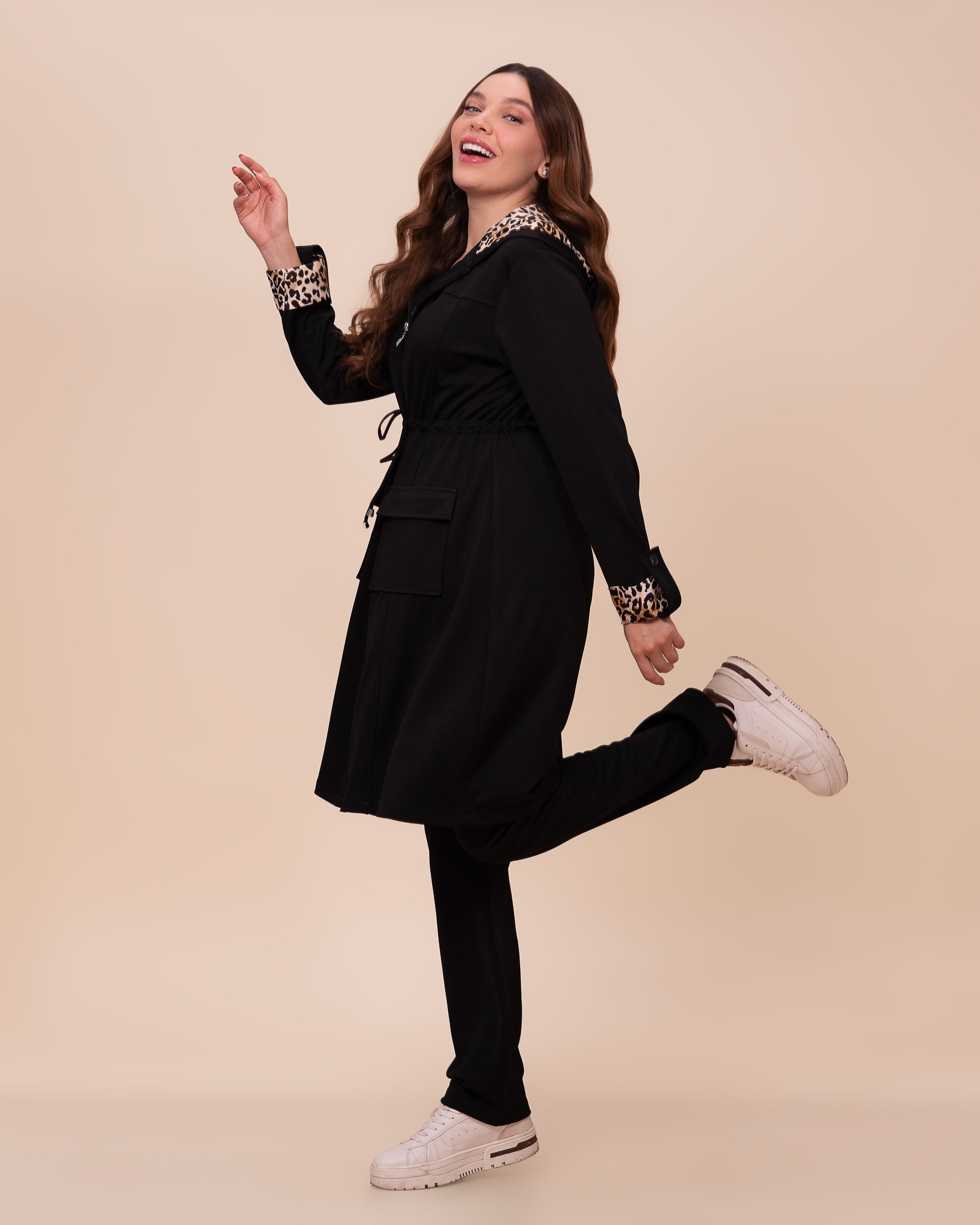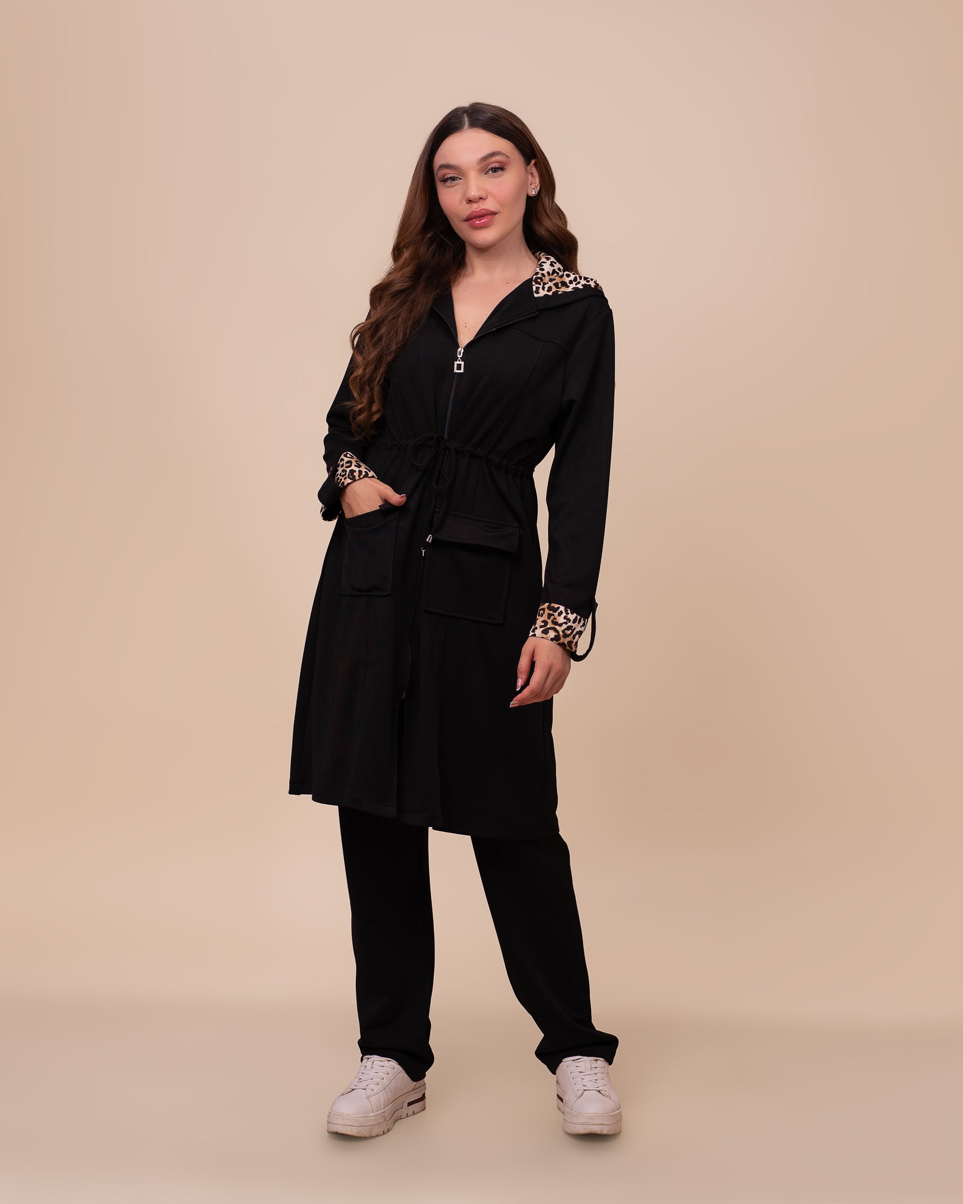 Adoptez un style tendance avec cet ensemble survêtement noir sublimé par des détails en soie . Son pantalon confortable, doté d’une taille élastique, s’associe parfaitement à son haut façon veste à capuche pour un look à la fois élégant et décontracté.